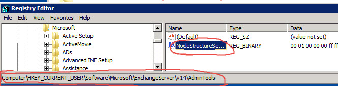 В реестре удалите в ветке HKCU\Software\Microsoft\Exchangeserver\v14\AdminTools\NodeStructureSettings  ключ NodeStructureSettings.